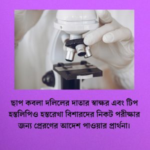 বাদী পক্ষে নিম্ম তফছিল বর্নিত ছাপ কবলা দলিলের দাতার স্বাক্ষর এবং টিপ হস্তলিপি ও হস্তরেখা বিশারদের নিকট পরীক্ষার জন্য প্রেরণের আদেশ পাওয়ার প্রার্থনা।